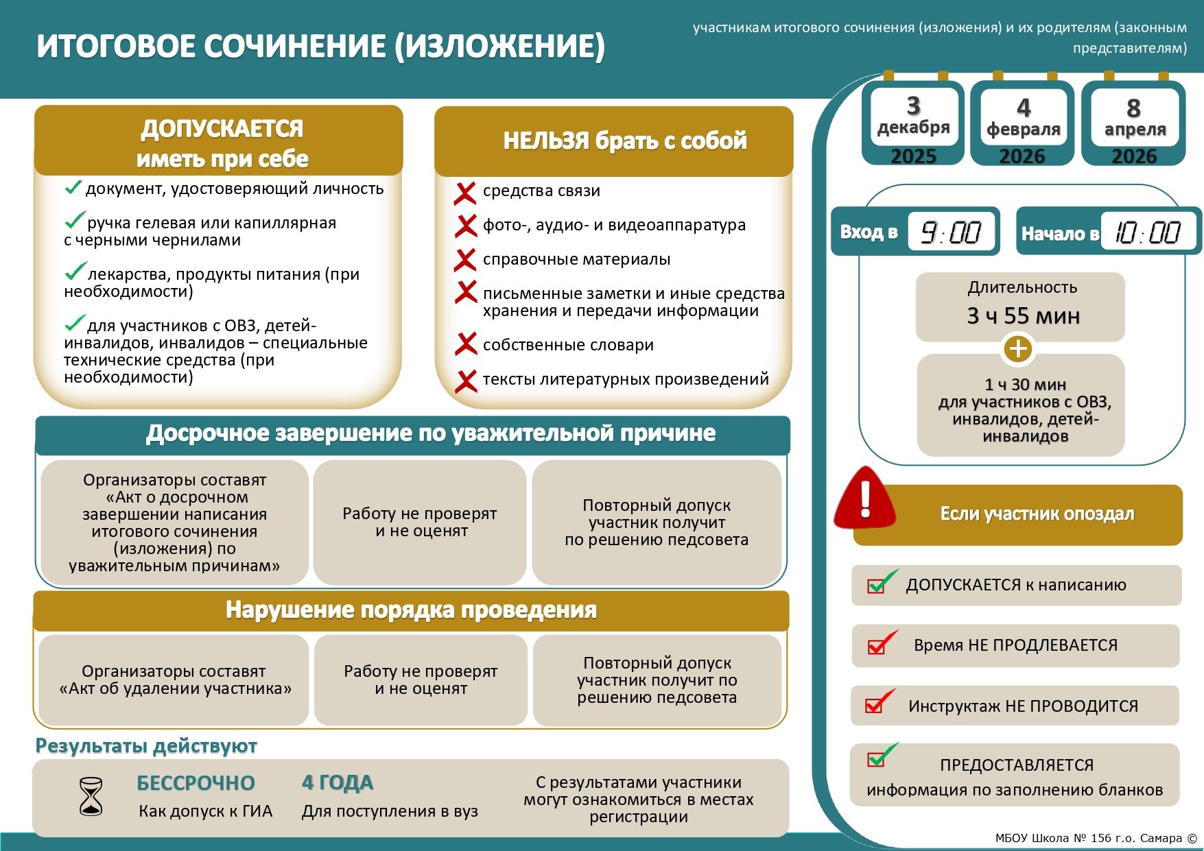 Даты проведения итогового сочинения 2025-2026: основная дата итогового сочинения – 3 декабря (среда) 2025 года резервные дни для сдачи – 4 февраля (среда) 2026 года и 8 апреля (среда) 2026 года.